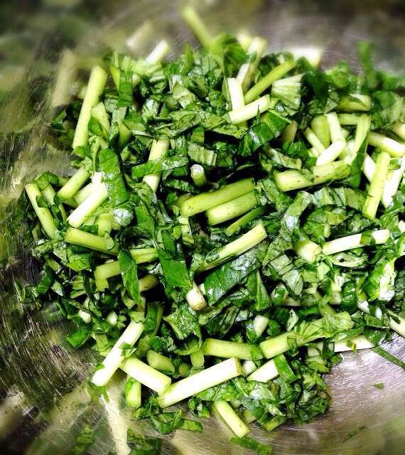 鍋に湯を沸かして火を止め、その中に茎と葉を入れて2~3分放置。