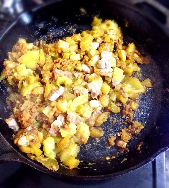 角切りした豚肉、青トマト4個を加えざっと炒めます