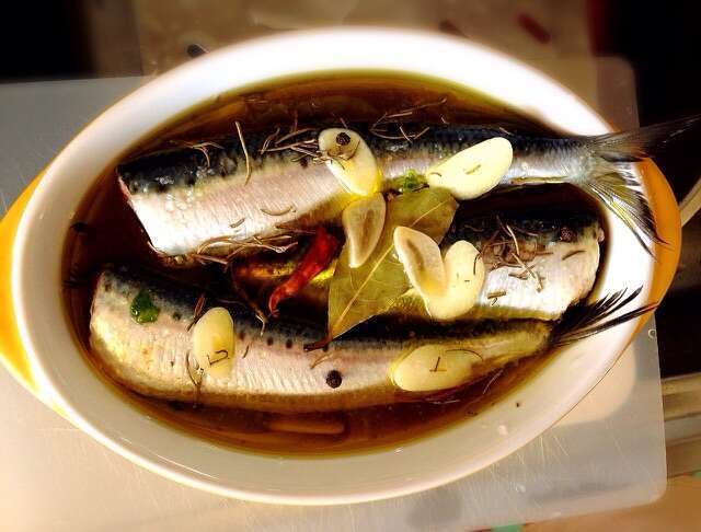 耐熱皿に入れてオリーブ油をヒタヒタに注ぎます。