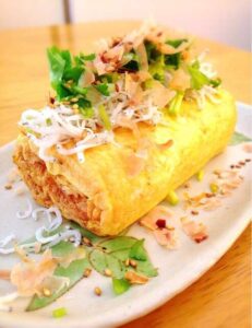 卵に豆乳ヨーグルトと桜海老粉を混ぜたふんわり厚焼き卵です。