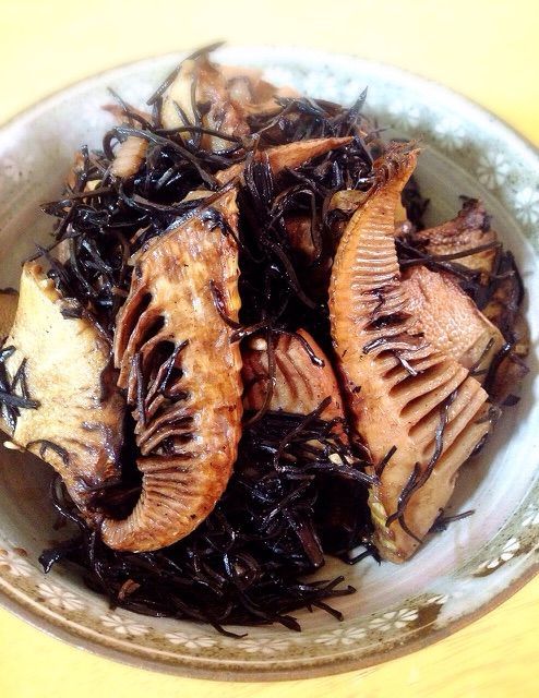 バターで炒めたたけのこをあらめとともに醤油のみで炊きます。