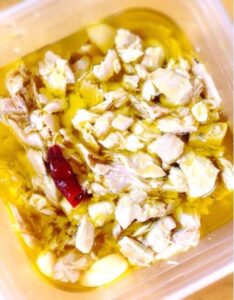 ほぐして煮た油に漬け込んで冷蔵庫にしばらくおき、馴染ませます。