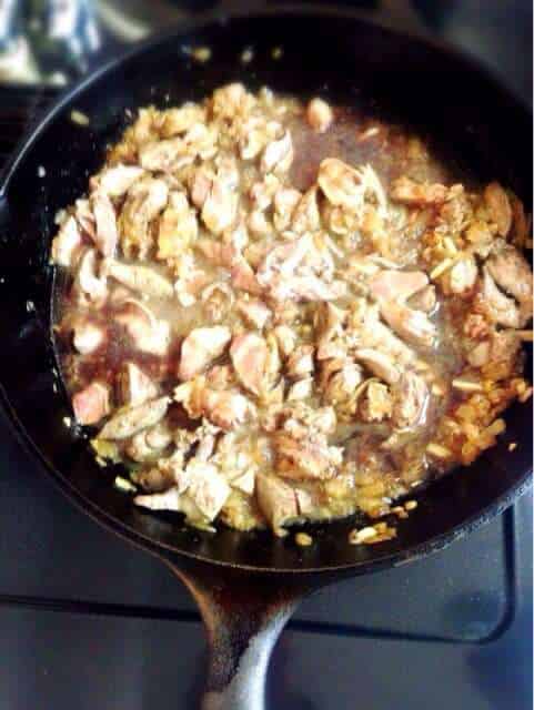 玉葱が茶色くなったら刻んだレバーを加え、炒め合わせます。