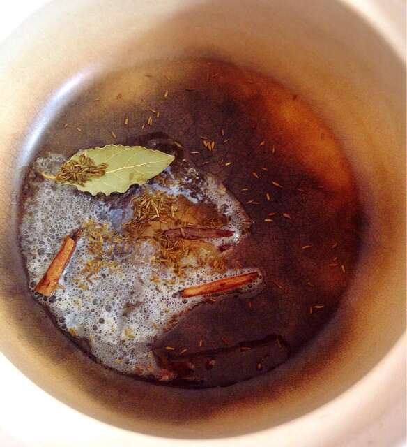 お鍋に◎のバター、クミンシード、ローリエ、シナモンスティックを入れ弱火にかけます。