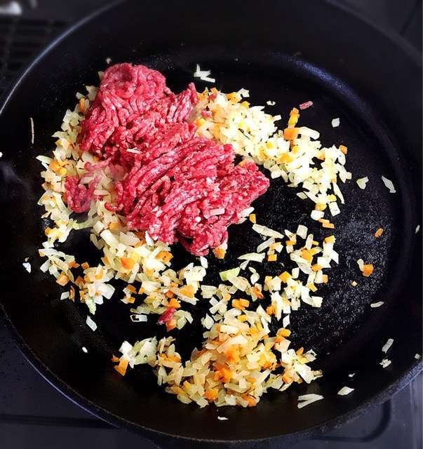 塩をまぶした牛挽肉を加えて炒め合わせます。