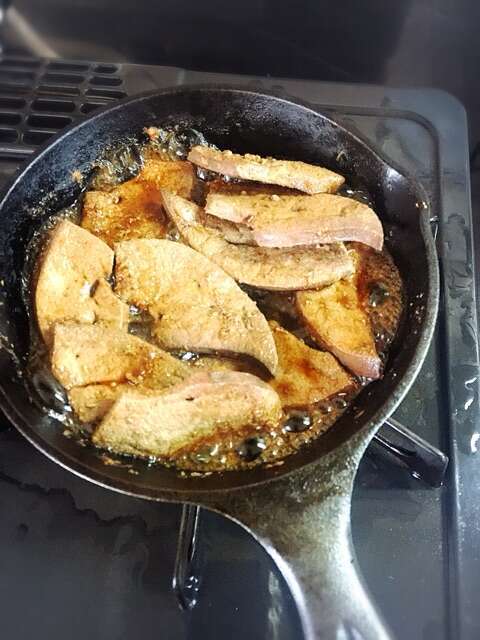豚レバーを醤油、酒、おろし生姜で煮詰めます。