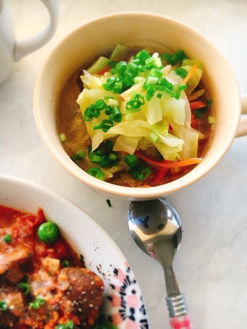 こちらはお野菜(玉ねぎ、人参、キャベツ)を加えてしばらく煮込んだ野菜スープにしました。