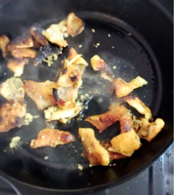 再び鶏皮をフライパンに戻し、みじん切りした生姜を加えて生姜の香りがしてくるまで炒めます。