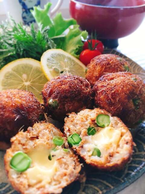 鱈を叩いて玉ねぎ、卵、グリーンピース、海老粉を加え混ぜ、丸めて桜海老粉をまぶして揚げます。