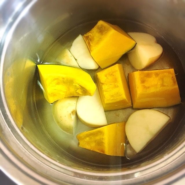 南瓜とジャガイモは適当な大きさにカットし、小鍋に入れて水150ccほど(分量外)と塩を加えて蓋をします。