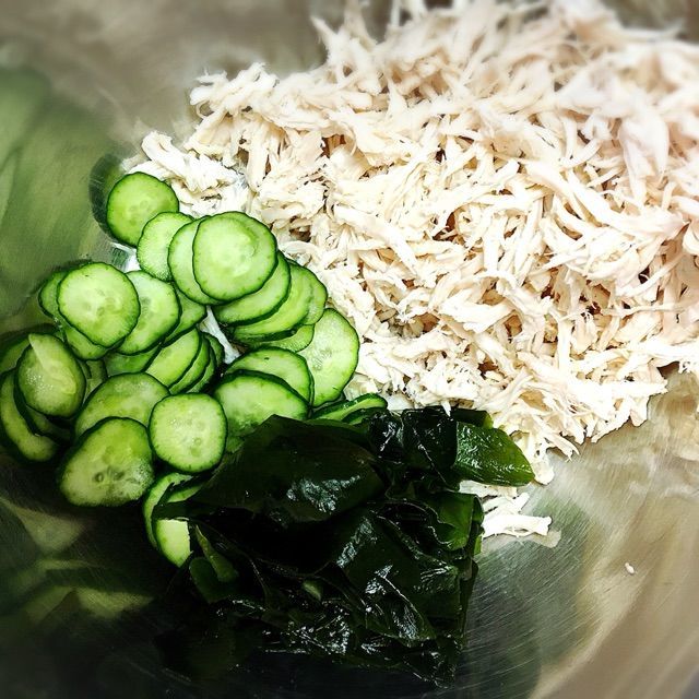 茹でたささみと胡瓜、若芽を梅干しと梅酢少々で和えます。