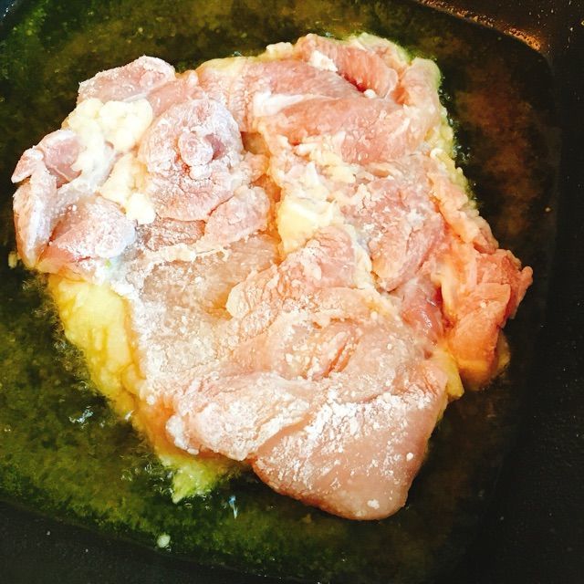 片栗粉をまぶした鶏ももを皮目下で入れてから点火します。
