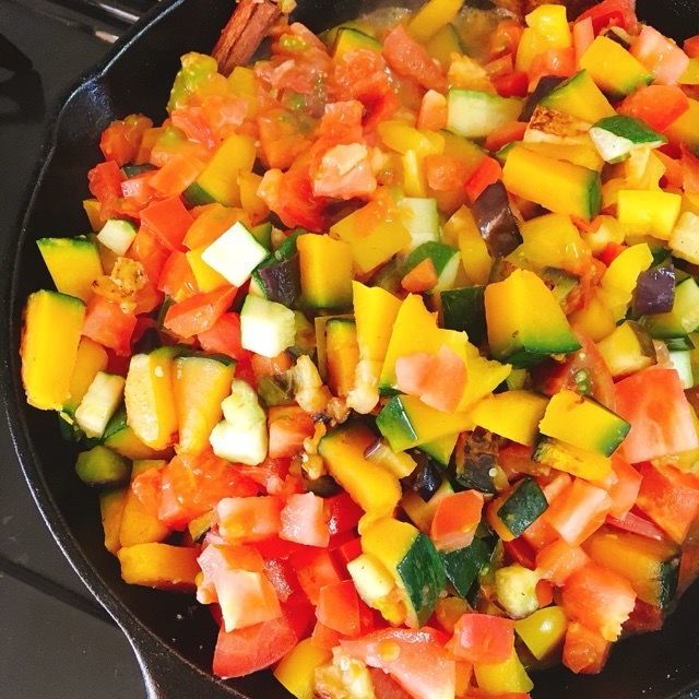 刻んだ夏野菜を強火で順に炒め、最後にトマトを加えて煮込みバルサミコ酢で味付けします。