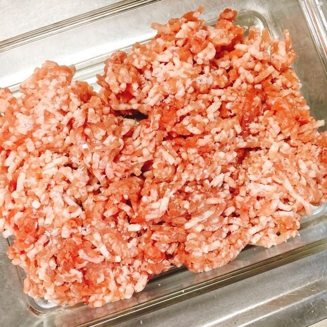大きめのグラタン皿に挽肉を入れ塩を振ってざっと混ぜ合わせます。