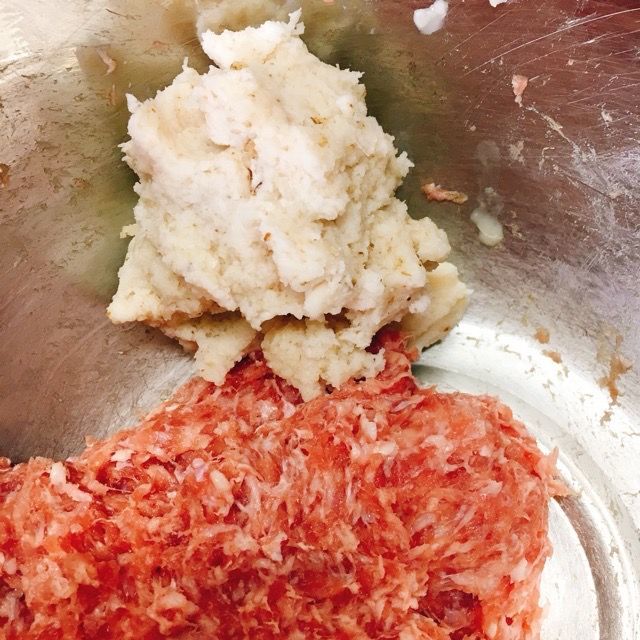 先ほど炒めた玉ねぎを冷まして加え、☆も加えてよく捏ね混ぜます。