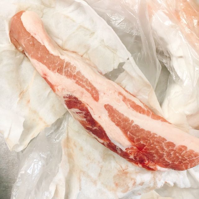 塩豚にした豚バラ塊肉を蒸し器で蒸してキムチと荏胡麻の葉を添えます。