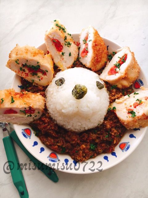 周りにキーマカレーを盛って海苔を切り目と鼻を付けます。