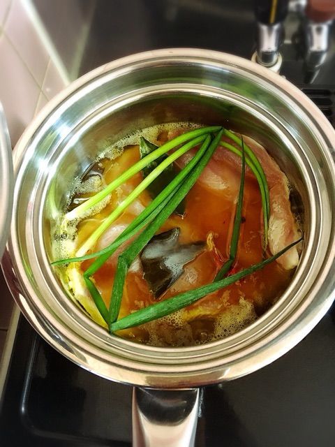 鶏胸肉をオイルと鷹の爪、ローリエ、粒胡椒で煮てそのまま漬け込みます。