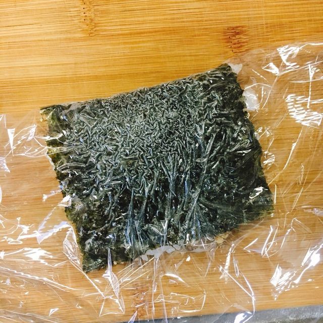 ラップを大きめに出して半分に切った海苔をのせ、豆ご飯をうっすらと敷き詰めます。