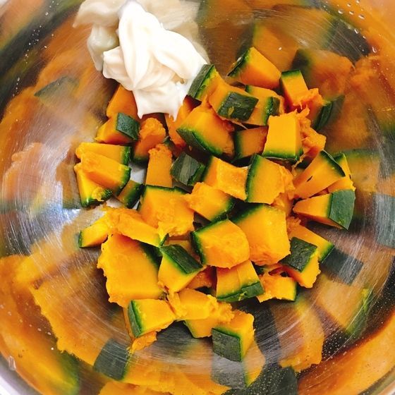 南瓜を適当に切って茹で、サイコロ状にカットしてお塩とマヨネーズで和えます。