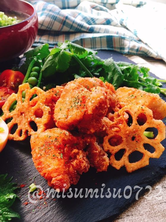 油を切ります。残りの油で付け合わせの蓮根も揚げます。