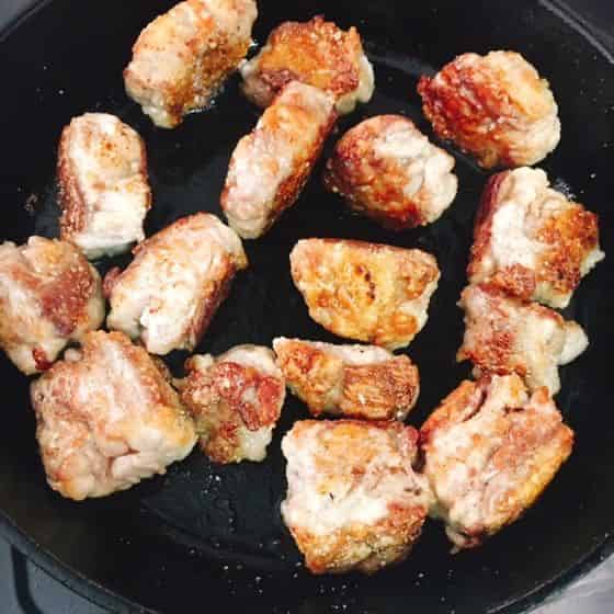 フライパンを熱して油(今回はラードを使用しています)を入れます。豚肉を並べ入れ強め中火で焼き色をつけます。