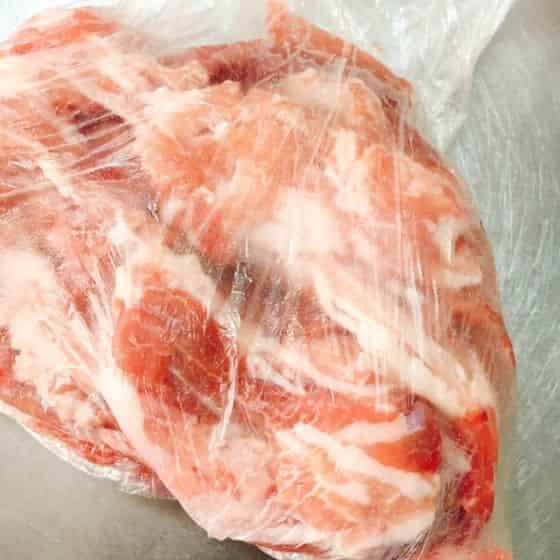 豚こま切れ肉に片栗粉をまぶし、ぎゅっと重ねたらまるで塊肉!