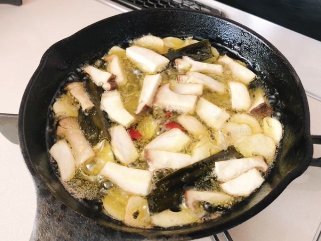 アンチョビペースト、ニンニク、鷹の爪、ちりめん、昆布を入れ塩を加えエリンギを散らします