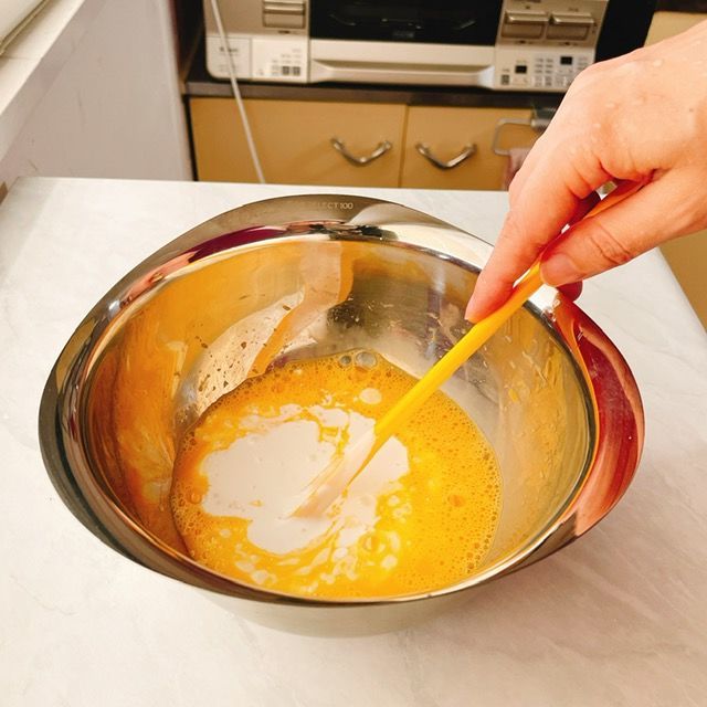 ボウルに卵を割りほぐし、ヨーグルトを加え混ぜます。