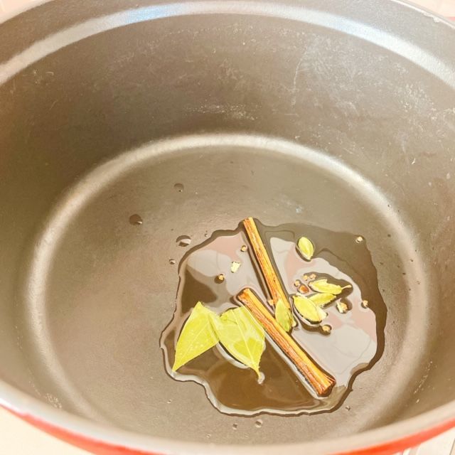 オイル、砕いたスパイス(ローリエ、シナモン、カルダモン)を加え弱火にかけます。