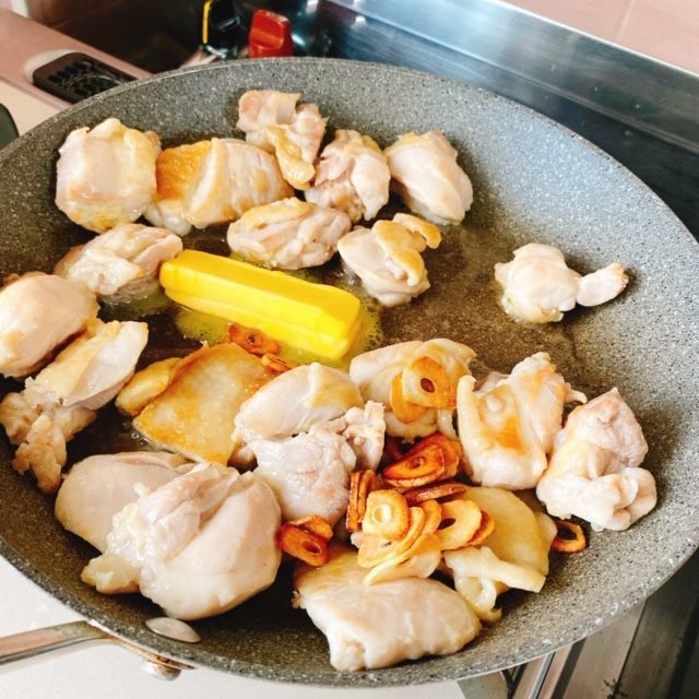 鶏肉に火が通ったら余分な脂を拭き取ります。