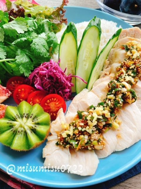 鶏胸肉で作る海南鶏飯(ハイナンジーハン/シンガポールチキンライス/カオマンガイ)です。