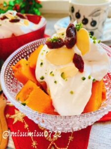 南瓜、パイナップルやマンゴー、小豆や白玉、ナッツ類やベリー類などとともにどうぞ