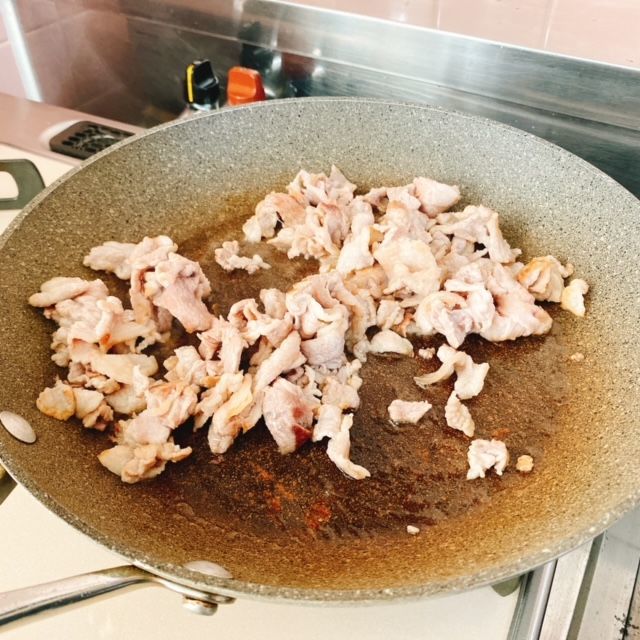 フライパンを熱して油を敷き、豚こまを入れ焼きます
