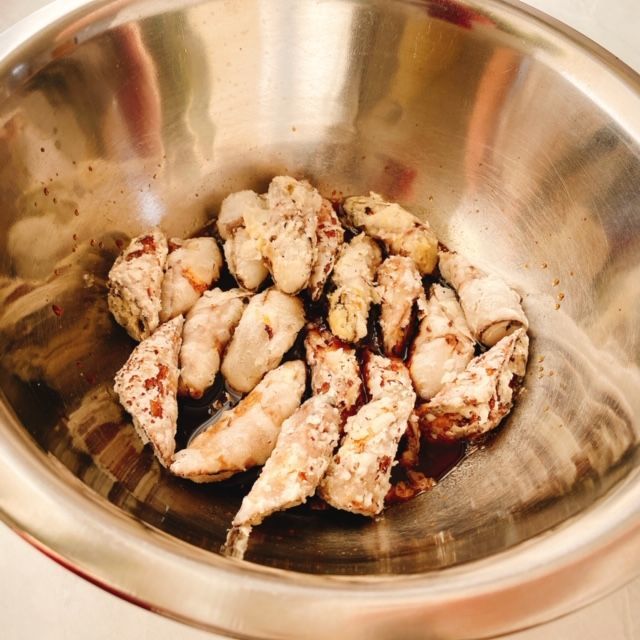 ビニール袋に入れ片栗粉を加えて振り混ぜます。