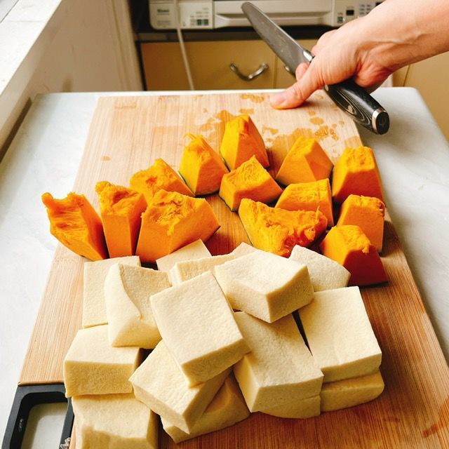 かぼちゃは種とワタを外し、高野豆腐と同じ位のサイズに切ります。