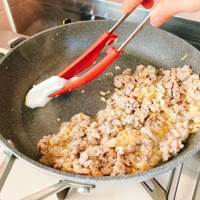 - Heat sesame oil in a frying pan and fry garlic, ginger, onion, green onion over low heat. When it’s fragrant, add the ground meat and fry. When the meat changes color, add the chili pepper and dried shiitake mushrooms and fry briefly. Add sake and bring it to a boil.