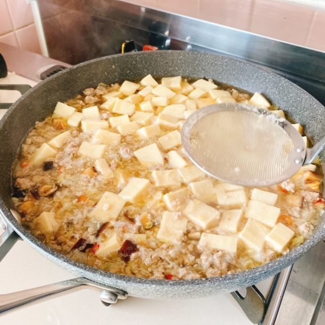 50〜60℃程度まで温まったら火を止め高野豆腐を加えます