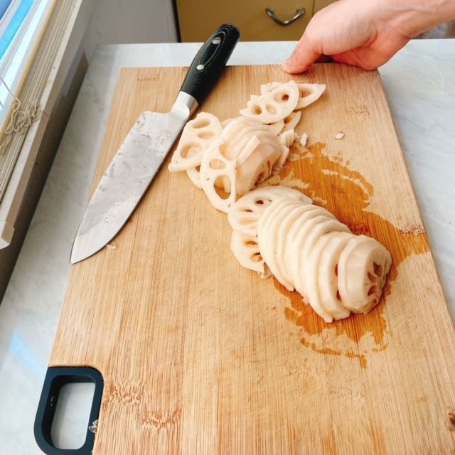 - Put sesame oil into a frying pan and grill the lotus roots. When it’s browned, turn it over and brown the other side as well.