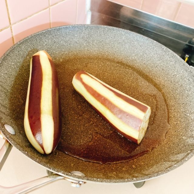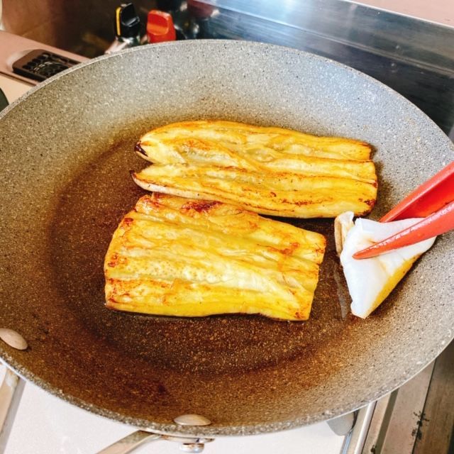 フライパンを熱して胡麻油とバターを溶かし、茄子を皮目下で入れて弱め中火で焼き付けます。