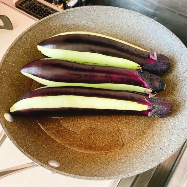 熱したフライパンに油を少し多めに入れ茄子を並べて中火で焼きつけます。