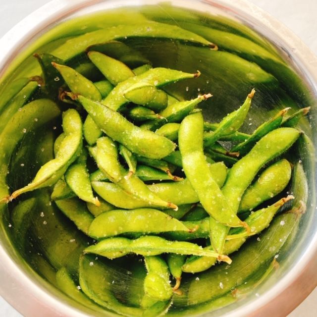 - Take out sausages, heat hot water, add salt and edamame, and boil it for four minutes.