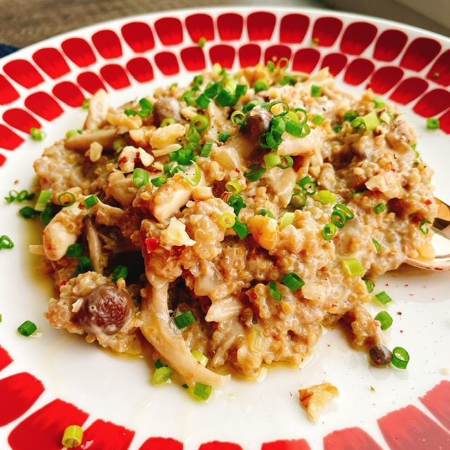 スーパーフードのキヌアをアーモンドミルクで煮込んだキノコリゾットとビーツを使ったマスタードサラダです。
