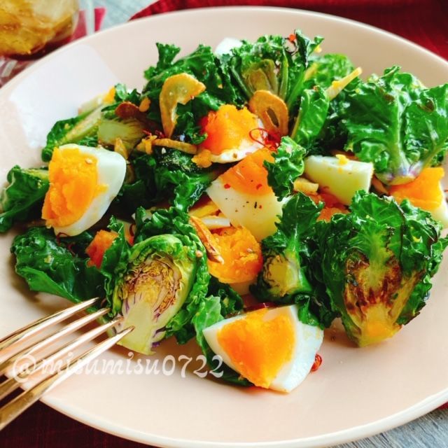 今回は、芽キャベツとケールの交配、プチヴェールのニンニク炒めです。
