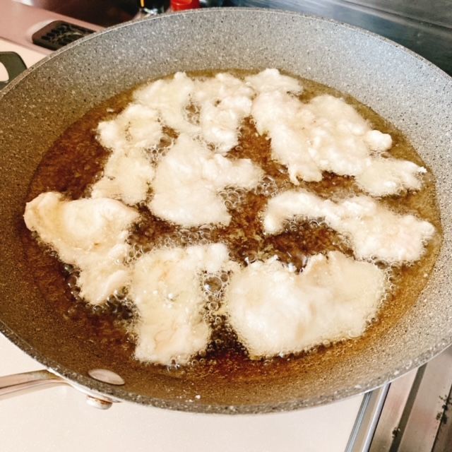 ささみを1切れずつ広げて入れ揚げ焼きします。