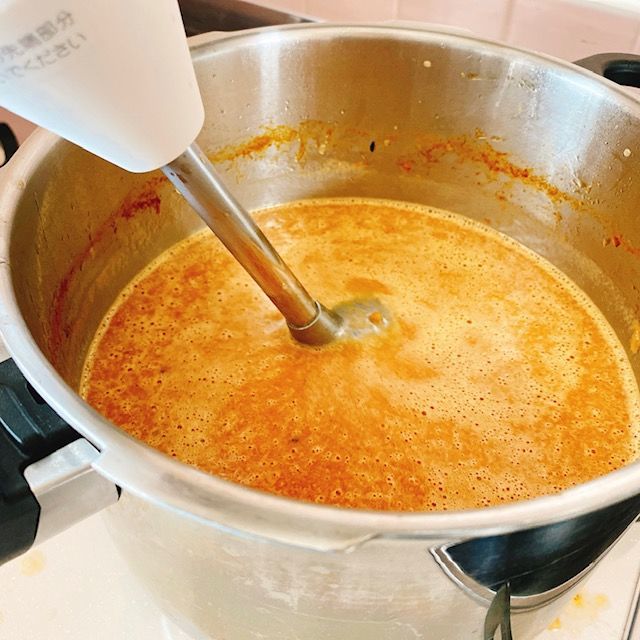 ハンドブレンダーを直接鍋に入れ攪拌します。