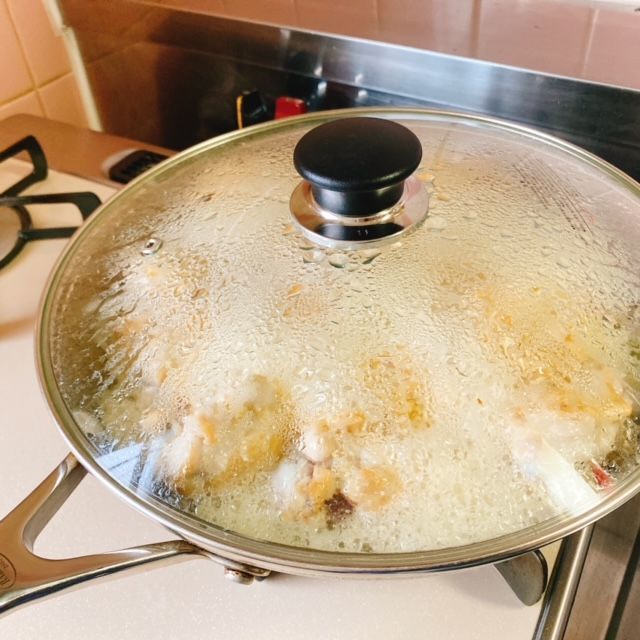4. When both sides are browned, add the mixed seasonings and put the lid on. Steam it for about ten minutes, open the lid and turn up the heat a little to evaporate the broth.