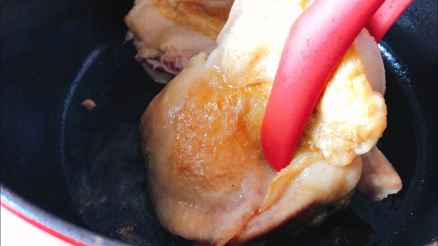 鍋を熱して油を敷き、鶏肉を皮目下で入れて焼きます